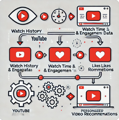 사용자의 시청 이력 → 시청 지속 시간 & 반응 데이터 → 유튜브 알고리즘 분석 → 개인 맞춤형 추천 영상 노출